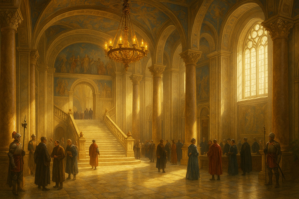 Visitors entering the chambers find themselves in a cavernous atrium dominated by a sweeping staircase of marble and gold-veined stone. Couriers and clerks hurry across the floor bearing scrolls, contracts, and decrees. Guards in lacquered armor stand at rigid attention, their halberds gleaming in the light. Nobles, guild leaders, and envoys from foreign lands wait here, speaking in hushed tones while awaiting summons to the council.