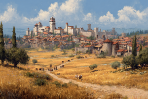 Beyond the walls of Aranthaes lies a land of mountain passes, deep valleys, and bustling trade routes. Whether by caravan along the Aranthaes Highway or by ship hugging the coastline, travelers will encounter a variety of ports, crossroads, and hidden corners of the island.