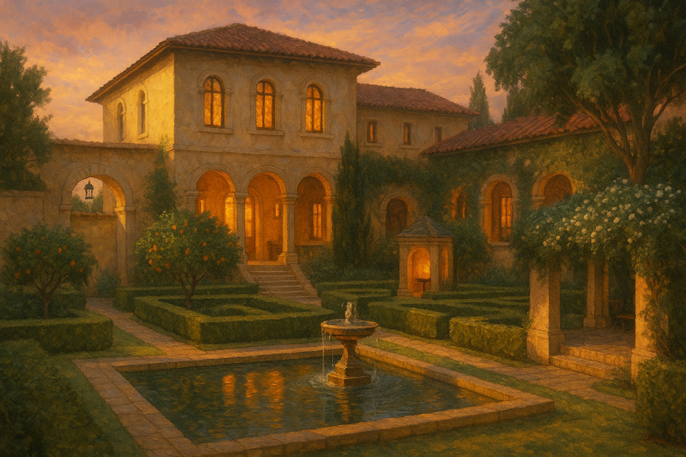 Walled courts hold orange and fig around tiled fountains. A maze of clipped box hides a small pavilion for private talks. Night jasmine lines a sheltered walk to the guest wing.