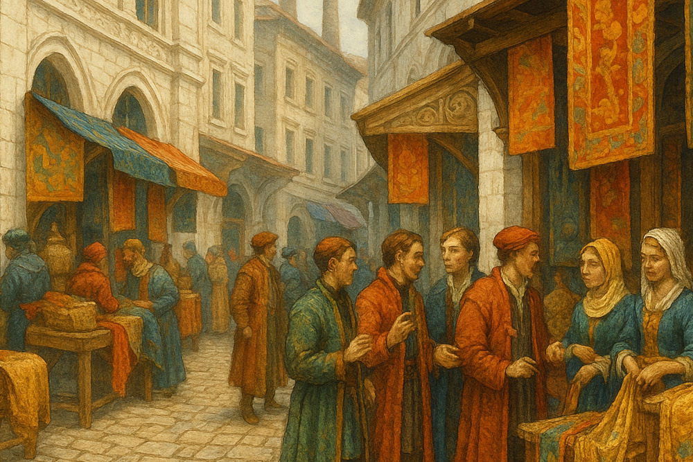 Carts rumble along cobbled lanes piled with bales of silk, cotton, and linen, while apprentices rush between artisan mills carrying baskets of thread and dyes. The hum of spinning wheels and the rattle of weaving frames fill the air, giving the district a restless energy that never seems to fade.