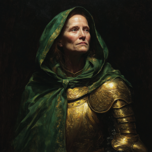 Her presence is unmistakable. Clad in gold-worked plate and wrapped in green, she appears less as a knight seeking glory and more as a living extension of the sanctum walls she guards. The great blade known as Mother’s Wrath rests easily in her grasp, carried not so much as a symbol of aggression but as a promise that sacred ground will not be violated lightly.